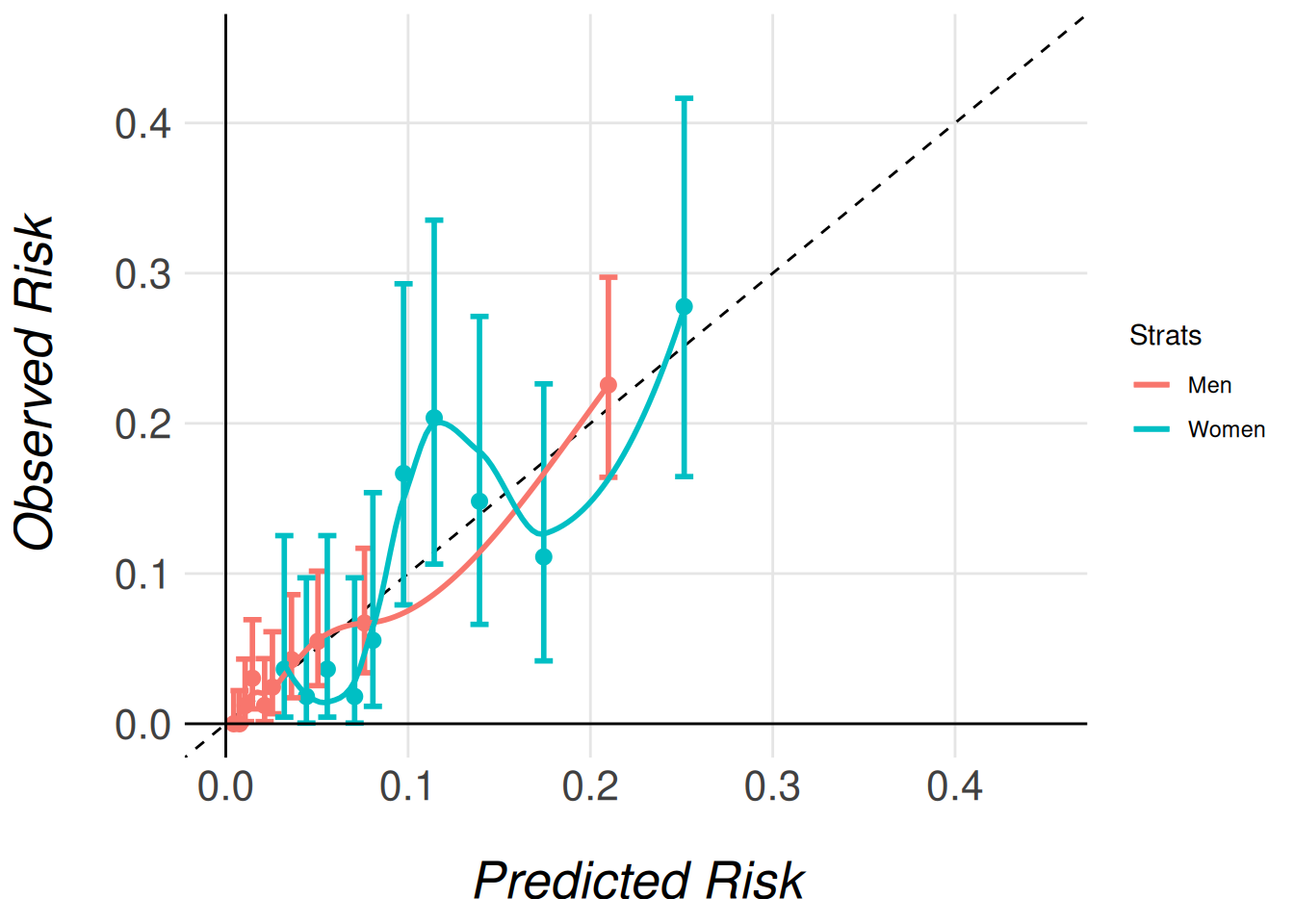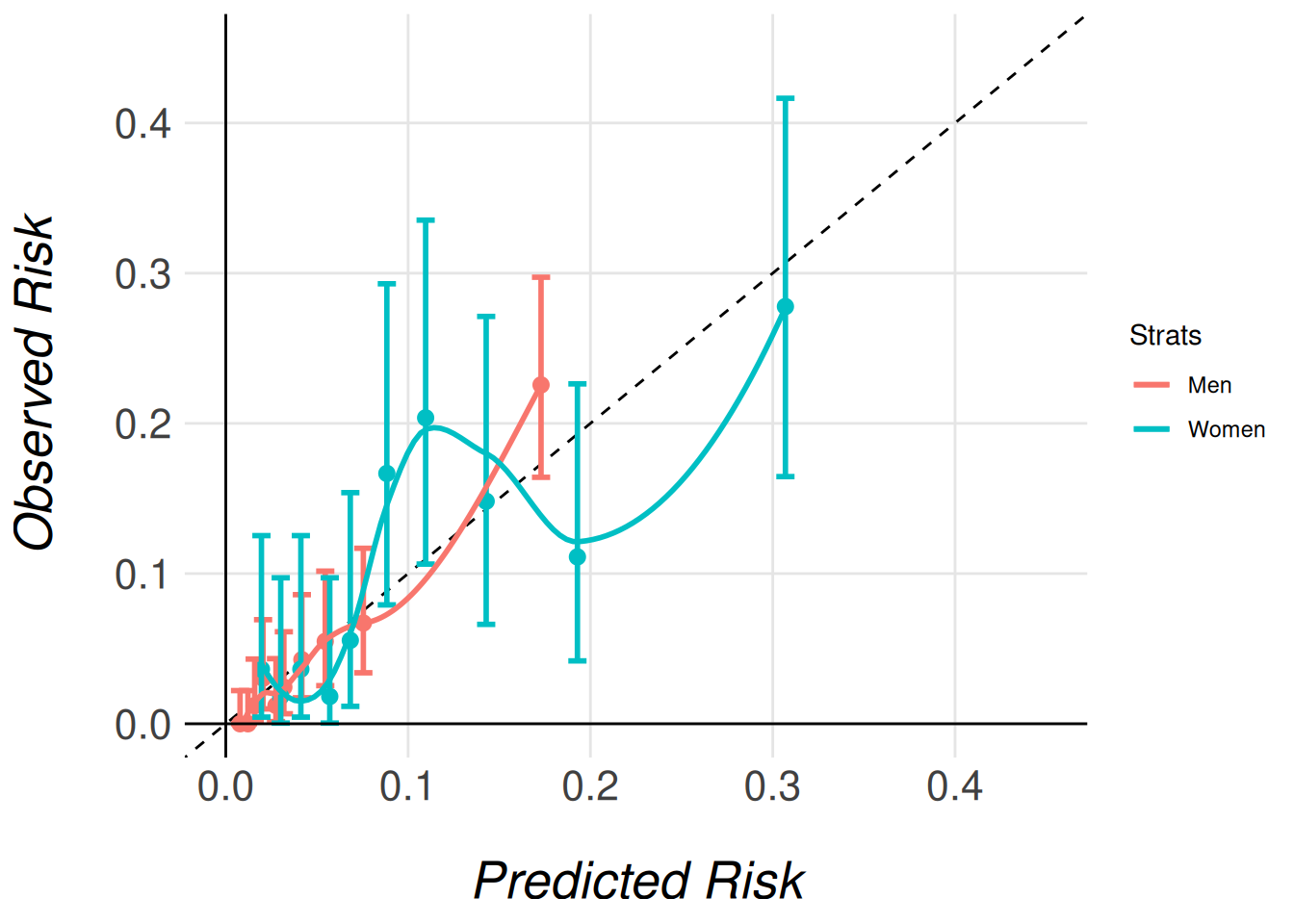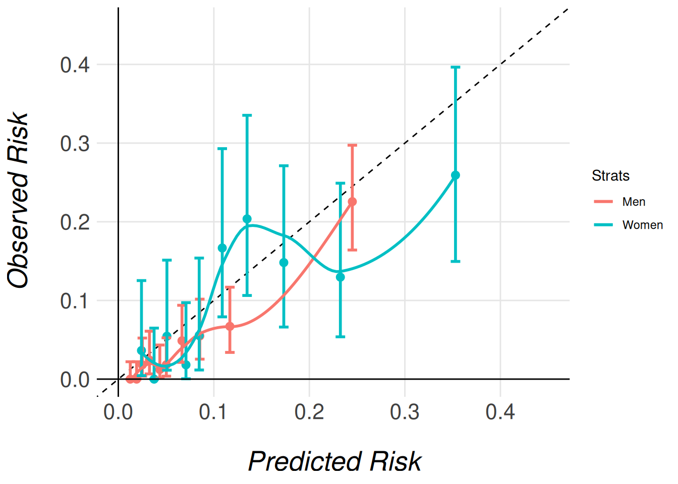 Once the results from both stratified models are stored, we can begin comparing the model performances. A useful starting point is to compare the calibration plots for the different subgroups. Similar to individual calibration plots, we have two functions depending on how we want to estimate the observed risks: